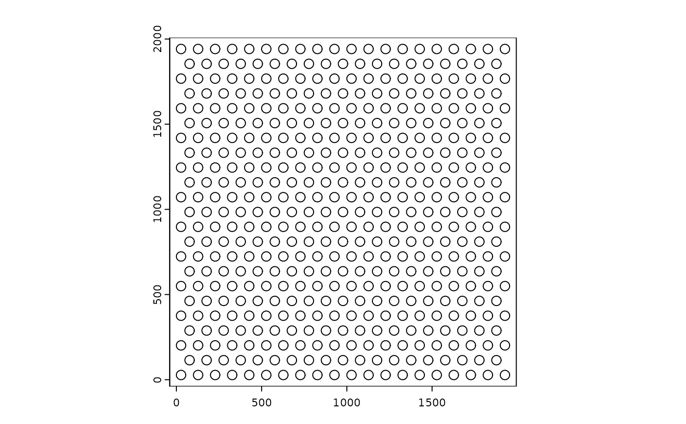 Generates a visium-like array of spots across a provided spatial extent.